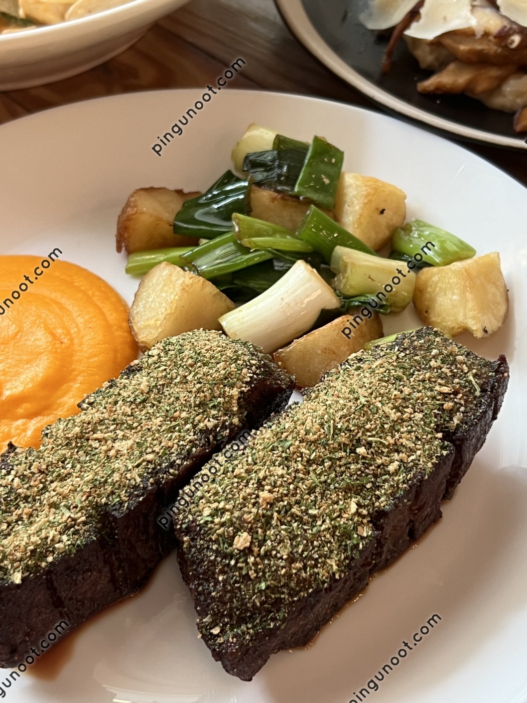 스테이크 - 부채살 스테이크와 감자, 대파 가니쉬